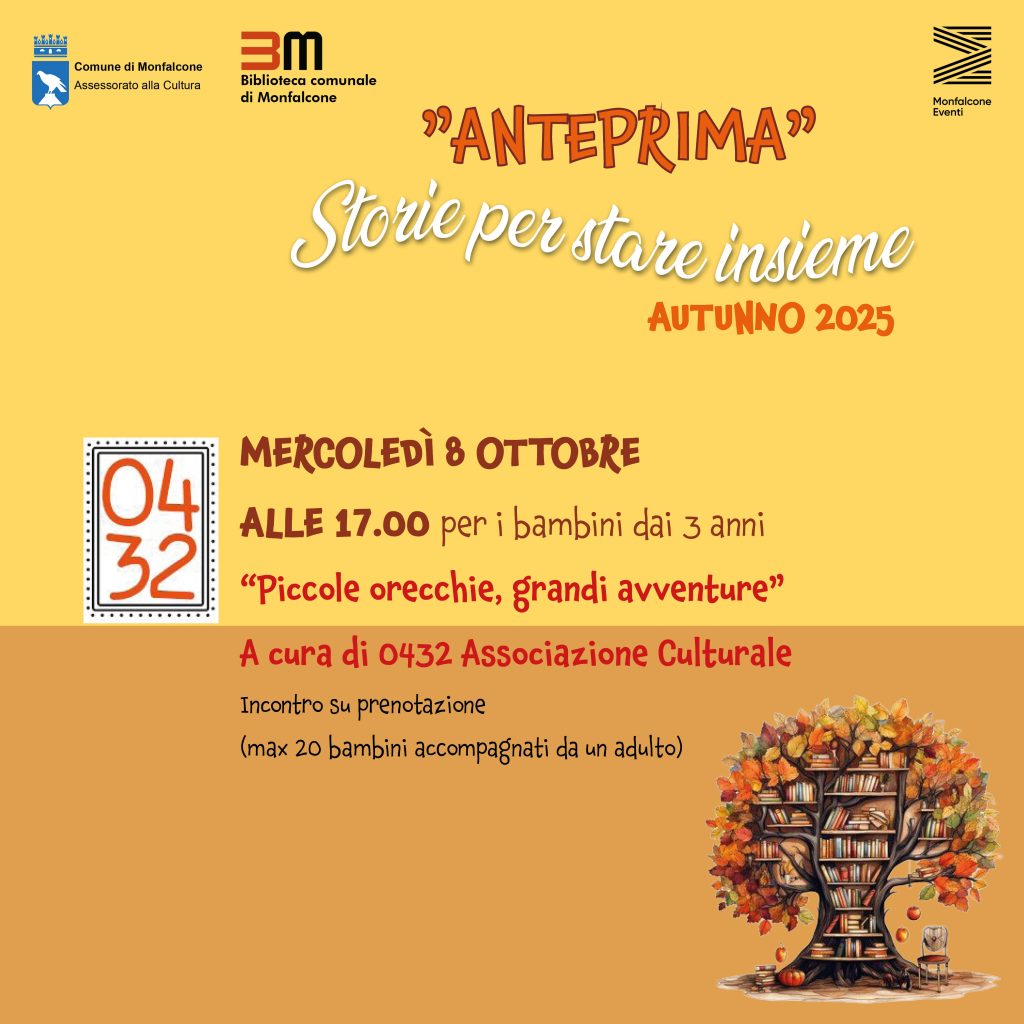 Mercoledì 8 ottobre alle 17.00 ospiteremo l’Associazione Culturale 0432, che curerà l’incontro “Piccole orecchie, grandi storie”, dedicato ai bambini (e ai loro genitori) dai 3 anni.