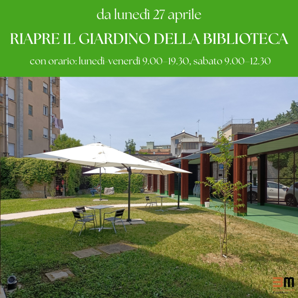 A partire da lunedì 27 aprile, la Biblioteca torna ad accogliere i visitatori nel suo spazio verde all’aperto, ideale per chi desidera rilassarsi o godersi una lettura in serenità.
